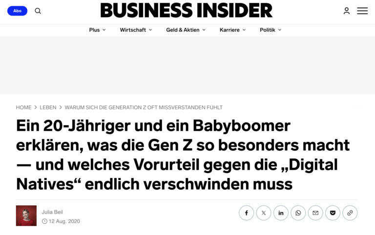 Business Insider "Ein 20-Jähriger und ein Babyboomer erklären, was die Gen Z so besonders macht – und welches Vorurteil gegen die 'Digital Natives' endlich verschwinden muss.“